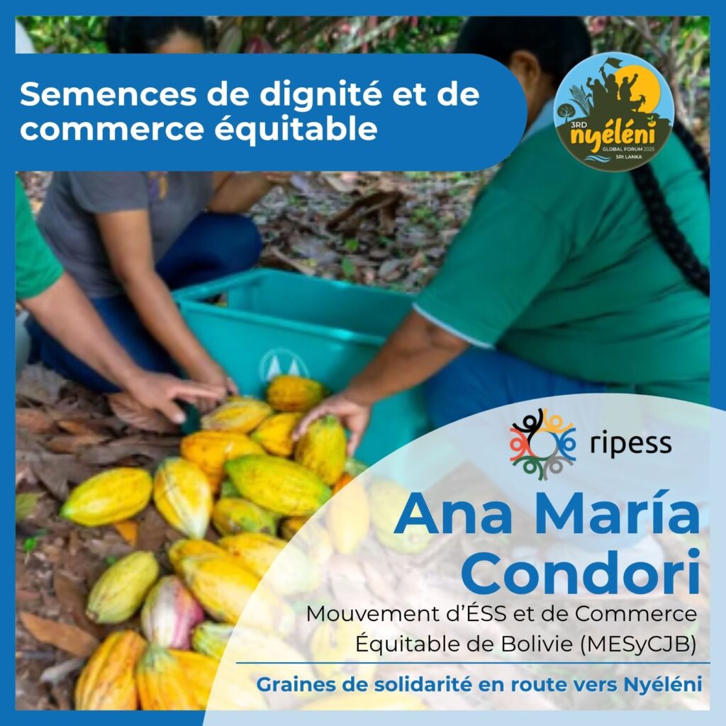 Aujourd’hui, en tant que dirigeante du Mouvement d’Économie Sociale Solidaire Communautaire et de Commerce Équitable de Bolivie (MESyCJB), Ana María œuvre pour renforcer les économies paysannes et autochtones en promouvant la production agroécologique, la récupération de semences natives, la commercialisation équitable et solidaire, ainsi que la défense des territoires. Le Mouvement organise des foires locales et des circuits courts, encourage la participation active des femmes et des jeunes, et développe des formations en leadership communautaire, équité de genre et gestion durable des biens communs. Il articule également des réseaux avec des organisations internationales et des plateformes régionales, en plaidant pour des politiques publiques qui garantissent le droit à l’alimentation et la protection de la Pachamama.