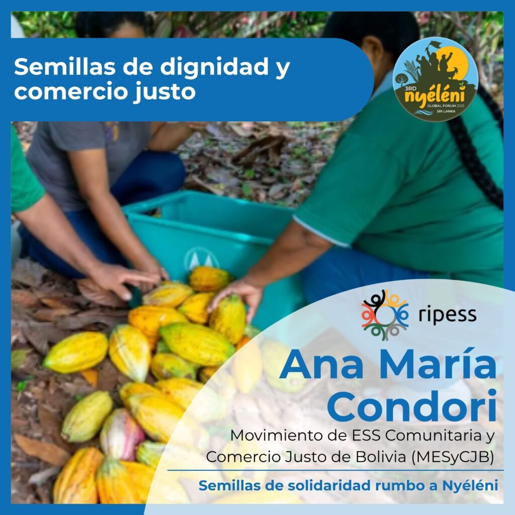 Hoy, como lideresa del Movimiento de Economía Social Solidaria Comunitaria y Comercio Justo de Bolivia (MESyCJB), Ana María trabaja por fortalecer las economías campesinas e indígenas, promoviendo la producción agroecológica, la recuperación de semillas nativas, la comercialización justa y solidaria, y la defensa de los territorios. El Movimiento impulsa ferias locales y circuitos cortos de comercialización, fomenta la participación activa de mujeres y jóvenes en la cadena productiva, y desarrolla procesos de formación en liderazgo comunitario, equidad de género y gestión sostenible de los bienes comunes. También articula redes con organizaciones internacionales y plataformas regionales, incidiendo en políticas públicas que garanticen el derecho a la alimentación y la protección de la Pachamama.