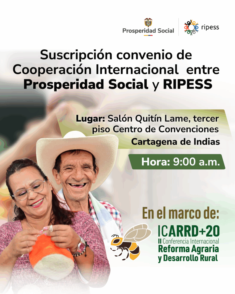 Aujourd’hui, 28 février à 9h00, dans la salle Quintín Lame (troisième étage) du Centre des congrès de Carthagène des Indes, aura lieu la cérémonie officielle de signature de l’accord de coopération internationale entre le Département administratif pour la prospérité sociale du gouvernement colombien et le Réseau intercontinental de promotion de l’économie sociale et solidaire (RIPESS).