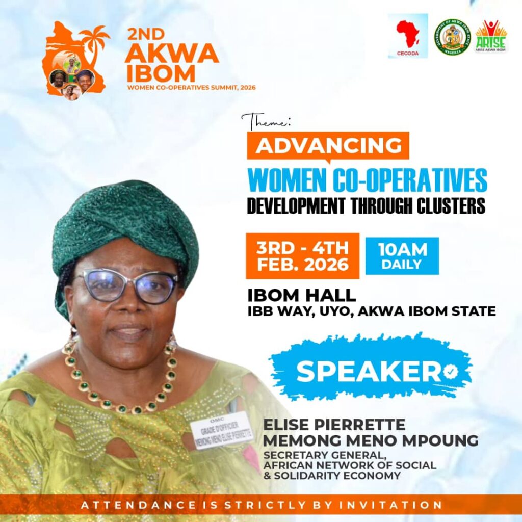 RIPESS se réjouit de la participation de Elise Pierrette Memong Meno en tant que conférencière principale (Keynote Speaker) au 2ᵉ Sommet des Coopératives de Femmes d’Akwa Ibom, qui se tiendra les 3 et 4 février 2026 à Uyo, au Nigéria.