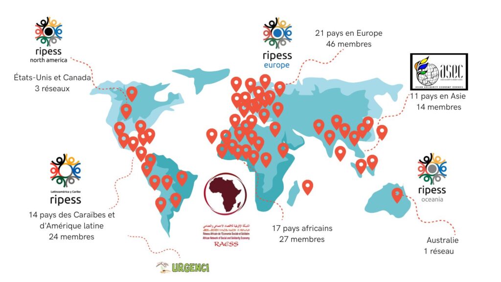 L’UNTFSSE a invité plusieurs organisations de l’ESS à participer en tant qu’observateurs à ses réunions, trois organisations ayant assumé ce rôle dans les premières années : l’Alliance coopérative internationale (ACI), l’association des Rencontres du Mont-Blanc (devenue ESS Forum International en 2016) et le RIPESS. L’inclusion de l’ACI reflète son statut reconnu de longue date au sein de l’OIT et le rôle historique des coopératives dans la promotion des pratiques d’économie sociale et solidaire, un engagement qu’elle a explicitement renforcé en 2017. De même, l’ESS Forum International a contribué à favoriser les échanges et les dialogues internationaux sur l’ESS, bien qu’avec une base organisationnelle plus limitée. Le RIPESS, en revanche, représente un réseau intercontinental unique qui s’est développé sur plus d’un quart de siècle, rassemblant diverses initiatives de terrain du monde entier (voir la carte ci-dessous). Cette portée et cette représentativité distinctives ont permis au RIPESS de jouer un rôle proactif dans le renforcement des travaux de l’UNTFSSE, notamment en contribuant en 2014 à la production de son premier document de position liant l’ESS au cadre des futurs Objectifs de Développement Durable.
