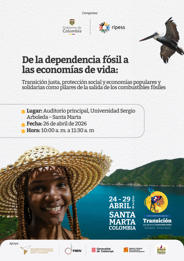 La sesión es organizada por el Departamento Administrativo para la Prosperidad Social – Gobierno de Colombia, en alianza con RIPESS, Fondo Mundial para el Desarrollo de las Ciudades, Grupo Semillas, Red Iberoamericana de Gobiernos por la Economía Social y Solidaria, y redes y organizaciones de economías populares, sociales y solidarias y finanzas solidarias en territorios afectados por el extractivismo fósil.