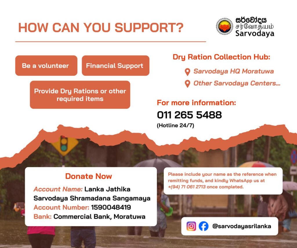 🤝 Nous invitons les partenaires, réseaux et alliés de l’économie solidaire à soutenir les efforts humanitaires et de relèvement précoce de Sarvodaya. Chaque contribution aide les familles à reconstruire dignement.